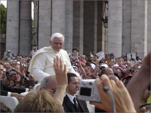 Da wussten alle, er war da. Der Papst. Benedikt der 16. Alles andere war auf einmal vergessen. Die schmerzenden Füße, vom langen stehen, oder der Sonnenbrand von gestern, der brannte. Es zählte nur eins. So nahe wie es nur ging an die Absperrungen hinkommen, sodass man den Papst möglichst gut sehen konnte. Und dann fuhr er auf einmal vorbei. Schnell ein Foto geschossen, dann war er schon wieder weg. In der Menge untergetaucht. Doch nun schritt er die Treppen vor dem Petersdom hinauf. Und der Jubel, der ohnehin schon laut war, wurde Ohrenbetäubend. Nachdem die Masse dann langsam beruhigt war und er alle Ministranten begrüßt hatte, begann er mit seinen Predigten. Alle hörten gespannt zu, auch diejenigen, die die Worte nicht verstanden. Nach seiner Predigt, die in viele Sprachen übersetzt worden war, beteten wir noch ein Pater Noster (Vater unser auf Latein) und dann war die Audienz auch schon fast wieder vorbei. Der Papst verabschiedete noch die ganzen Kardinäle, aber wir sind dann schon gegangen, denn nun haben wir noch Trastevere besucht, das Pantheon, den Circus Maximus und die Engelsburg (im vorbeigehen) angeschaut und sind am Tiber entlanggelaufen. Doch alles war irgendwie nicht mehr wie vorher. Unsere Gruppe war anders... ruhiger. Und es gab nur ein Gesprächsthema: Der Papst. Und dieses Thema hielt sich noch den ganzen Abend. Bis zum nächsten Morgen. Aber da verstummte es langsam, weil wir soviel neues gesehen haben. Keinen Papst. Dafür den Petersdom von innen und die Piazza Navona. Und alle haben an „Illuminati“ von Dan Brown gedacht, als sie den Vier-Strom-Brunnen sahen.